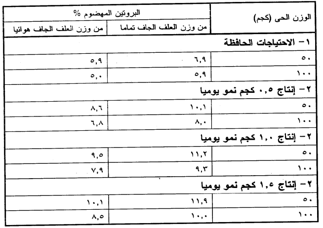 والجدول التالي يحدد احتياجات العجول الهولستين من البروتين المهضوم على أساس نسبة من المادة الجافة للغذاء.