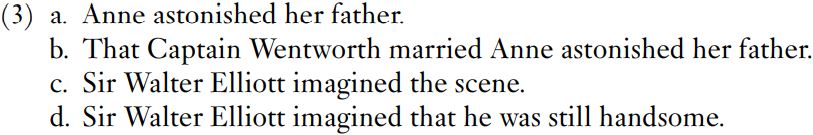 We can say something about where clauses occur in sentences. Relative clauses are embedded in noun phrases and immediately follow the head noun. (But not always, as in the well-used example I got a jug from India that was broken.) Verb complement clauses substitute for either noun phrase with a transitive verb. Anne in (3a) is replaced in (3b) by the complement clause That Captain Wentworth married Anne. The scene in (3c) is replaced in (3d) by the complement clause that he was still handsome. The complement clauses can be analyzed as occupying noun-phrase slots.
