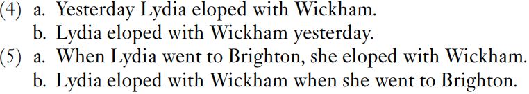 Time adverbs such as yesterday occur at the beginning of a clause or at the end of the verb phrase, as in (4), and adverbial clauses of time typically occur in the same positions, as in (5).