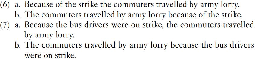 Adverbial clauses of reason behave in a similar fashion. Compare (6) with the phrase because of the strike and (7) with the clause because the bus drivers were on strike. Both can precede or follow the main clause, and both are optional (adjuncts).