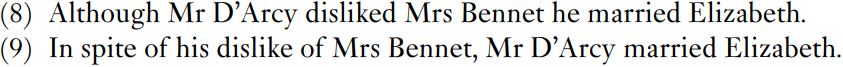 The phrase in spite of is not obviously a concession phrase, whereas yesterday and because of the strike are clearly time and reason phrases respectively. Example (9) nonetheless expresses a concession.