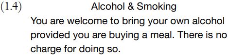 The leaflet then switches to another topic, inviting us to infer that no provision is made for smoking. We cannot be certain. They might simply have forgotten to add something permissive that they intended to say about smoking, but it could be a pointedly negative hint to smokers. Nothing in the leaflet actually says that smoking is unwelcome or disallowed; so this implicature from (1.4) and its context is an elaboration well beyond the literal meaning of what appears in the leaflet.