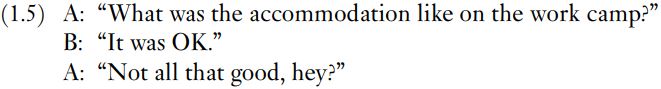 The stage of explicature – before implicature (see Section 1.1.2) – would have involved understanding that, in the context of A’s question, B’s utterance in (1.5) has as its explicature ‘The work camp accommodation was OK’, the work camp being one that B had knowledge of and which must previously have been identified between A and B, probably earlier in the conversation.