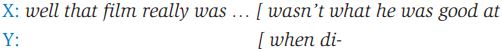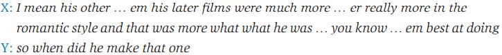 In the next example, speaker X produces filled pauses (with em, er, you know) after having almost lost the turn at his first brief hesitation.