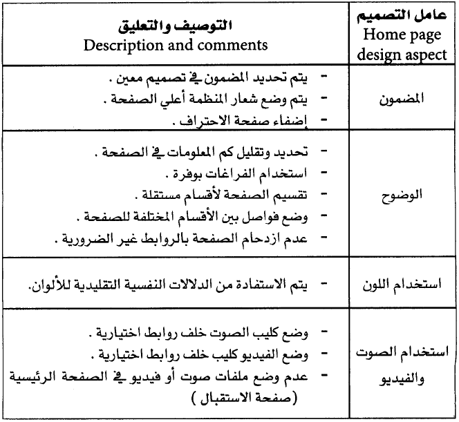 وبالنسبة للصفحة الرئيسية للموقع فهناك عدد من عوامل التفاعل من خلال التصميم التي يتعين على فريق العمل أخذها في الاعتبار، وتشمل المضمون، ووضوح التصميم، واستخدام اللون والرسوم ومواد الصوت والفيديو، ويلخص ذلك الجدول التالي.