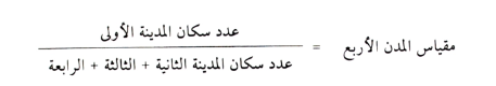 وتوضح هذه النسبة مدى حجم أكبر المدن في الدولة إلى المدينة الثانية، ومنها يمكن معرفة مدى تركز السكان بها، ودرجة مركزيتها وسيادتها على الإقليم. وإذا ما نسبنا سكان المدينة الأولى إلى سكان المدن الثلاث التالية، فإننا نحصل على مقياس يعرف بمقياس المدن الأربع Four City Index، وهو كما يلي: