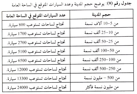 وقد أجريت في بعض الدول الصناعية دراسات عدة بهذا الصدد، ووضحت أن متوسط عدد السيارات في ساحات الانتظار يتمشى مع حجم المدينة كما يوضحه الجدول التالي: