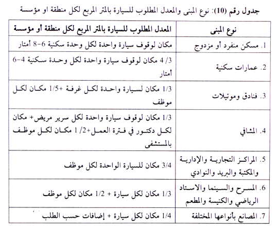 فإذا ما علمنا أن حجم السيارة الصغيرة نحو 7 أمتار مربعة، وكان عددها في المدينة الأولى نحو 400 سيارة، فسوف يخصص لها ما مساحته 400×7=2800 متر مربع. وإن كانت سيارة كبيرة وعددها 200 سيارة فمعنى ذلك تحتاج إلى 40×200=8000 متر مربع (8 دونمات). وإن كانت من السيارات ذات الحجم المتوسط 15 مترا، وبلغ عددها 200 سيارة، فسوف تخصص لها ما مساحته 15×200= 3000 متر مربع، موزعة على الأحياء السكنية في المدينة. وهكذا ينطبق هذا الإجراء على أحجام المدن المختلفة الواردة في الجدول السابق .