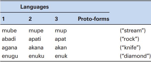 Which of the two lists, 2 or 3, contains the older forms? Remembering one other “most natural development” type of sound change (i.e. final vowels often disappear), we can propose that the words in language 3 have consistently lost the final vowels still present in the words of language 2. Our best guess, then, is that the forms listed for language 2 are closest to what must have been the original proto-forms.