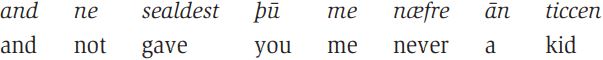 In the last example, the use of the negative also differs from Modern English, since the sequence *not gave (ne sealde) is no longer grammatical. A “double negative” construction was also possible, as in the following example, where both ne (“not”) and næfre (“never”) are used with the same verb. We would now say You never gave rather than *You not gave never.