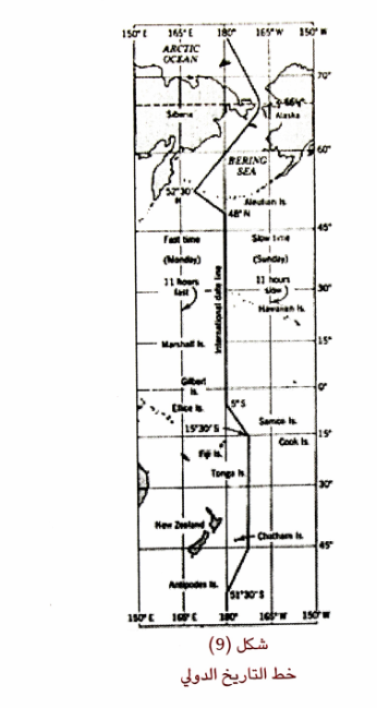 يفترق خط التاريخ الدولي عن خط الطول 180 درجة عند الطرف الأقصى لسيبيريا، جاعلاً كل الأراضي الروسية إلى الغرب منه، ثم عند مجموعة جزر كوريل جاعلاً إياها جميعاً إلى الشرق من موقعه، وأخيراً يحيد عن اتجاهه نحو الشرق عند جزر المحيط الهادي الجنوبي، جاعلاً معظم المجموعات الجزرية العديدة في تلك المنطقة تقع إلى الغرب من مساره، (شكل9).