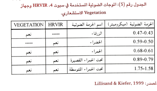 كما أن هذا النظام قادر على دمج صور بميز مكاني 20 م مع صور بميز مكاني 10م وهو في الفضاء، إن عملية دمج صور فضائية بموجات مختلفة وبميز مكاني مختلف ينتج عنه صور فضائية محسنة تحمل حسنات الصورتين، حيث ينتج صورة ذات ميز مكاني 10م وبثلاث حزم ضوئية ، أما الجهاز الاستشعاري الذي أضيف إلى سبوت 4، أساساً لمراقبة النبات ودراسته. كما يستخدم في الدراسات المائية، حيث إن مقدار التغطية الأرضية لهذا الجهاز الاستشعاري كبير جداً يصل إلى 2250 كم 2250 كم، أ أما حجم الخلية أو الميز المكاني فهو حوالي 1 كم، ويتم تكرار تصوير المنطقة الواحدة يومياً، أي تؤخذ صورة فضائية لكل نقطة على سطح الأرض يومياً. إن الصورة المأخوذة بالنظام الاستشعاري Vegetation المحمول في سبوت 4 تستخدم عادة في الدراسات على مستوى الأقاليم والقارات والعالم، نظراً لتغطيتها الأرضية الكبيرة جداً. انظر جدول رقم (5).