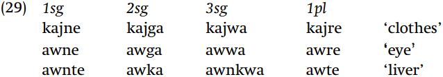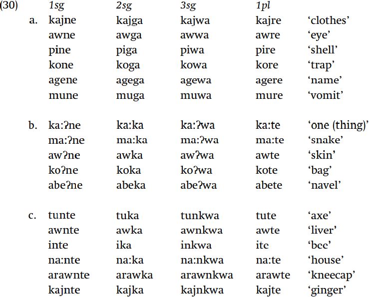 In (a), the invariance of the portion that precedes ne in the 1sg, ga in the 2sg, wa in the 3sg, and re in the 1pl suggests that these roots are /kaj, aw, pi, ko, age, mu/, further leading to the conclusion that the suffixes are /-ne/ ‘1sg’, /-ga/ ‘2sg’, /-wa/ ‘3sg’, /-re/ ‘1pl’, or some phonologically similar form. Having identified the root–suffix boundary, we can now proceed with the phonological analysis of underlying forms and rules.