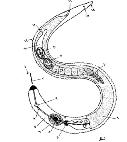 شكل يبين رسم تخطيطي ونموذجي للنيماتودا الضارة بالنباتات يبين مجمل أجهزة وأعضاء جسم الانثى وهي كالاتي حسب ارقامها: