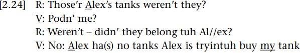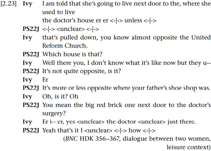 As we noted, shared discourse plays a role in feeding common ground. Here we see the participants using discourse to establish common ground. Example [2.23] illustrates how what is being referred to, the referent, emerges in the interaction, and how the two interlocutors collaborate in working it out.