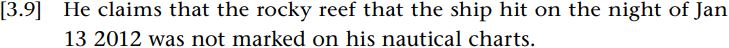 Consider the embedded clause in isolation: “The rocky reef that the ship hit on the night of Jan 13 2012 was not marked on his nautical charts.” Here, the definite NPs, the rocky reef, etc. and his nautical charts, trigger existential presuppositions – assumptions that these things exist. But the presence of the main verb, claims, a non-factive verb, introduces a rather non-committal stance; we are not sure whether the rocky reef, etc. and nautical charts exist. Of course, generally it is the case that if presuppositions in such complex sentences are considered in the context of the broader discourse and background knowledge, it is quite clear how one should take them (there was ample evidence, not least from TV footage, that the ship was on a rocky reef, and we can readily assume that a ship’s captain would have nautical charts). Cases where a presuppositional clash remains are thus likely to be taken as bizarre or humorous. Consider this apparently real question asked in a US courtroom trial: