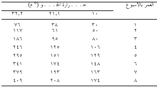 جدول يوضح الماء المُستهلك لكل ١٠٠٠ طائر في اليوم (لتر)