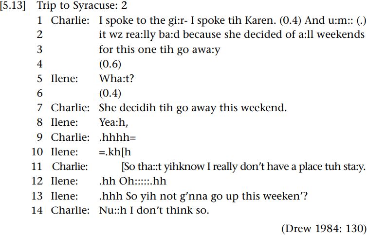 Charlie outlines potential trouble for their forthcoming trip to Syracuse when he reports that Karen is going away (lines 1–7), and so he doesn’t have anywhere to stay (line 11). This is taken by Ilene as indicating that Charlie won’t be able to go up to Syracuse, an understanding that is evident from her formulation of the upshot of his reporting (line 13), and subsequently confirmed by Charlie (line 14). Note, however, that Charlie has managed to indicate to Karen that he won’t be able to give her a ride without having said as such, and, more importantly, that this joint understanding only emerges over a number of turns of talk.