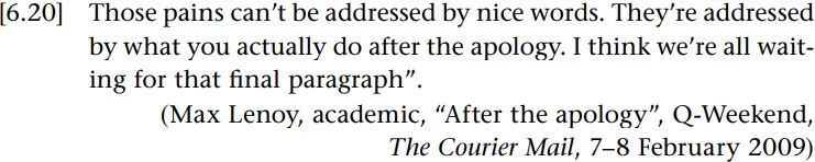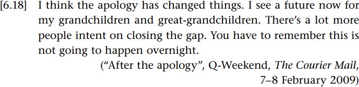 This apology was received by many Australians as genuine and sincere as it conformed to both “everyday and formal understandings of the necessary linguistic features of a legitimate apology” (Augustinos et al. 2011: 527), at least in English, we might add. However, the reaction amongst indigenous Australians was more mixed. On the one hand, the address was treated as an appropriate and sufficient apology by some, as illustrated by the following reaction from a member of the Stolen Generations, Uncle Albert Holt: