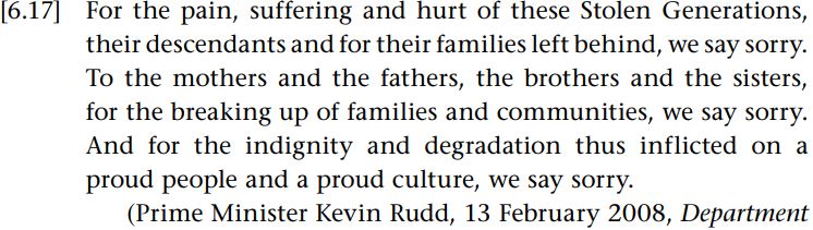 The performance of public apologies, even within nation states, is often more complex than at first appearance, due to the different understandings and footings of recipients. In early 2008, then Prime Minister Kevin Rudd delivered a formal apology in the Australian parliament to the “Stolen Generations”, indigenous Aboriginal and Torres Straits Australians who were forcibly taken from their homes as children and forced to assimilate with white Australian families over a period of 100 years from 1869–1969. The core of the “sorry speech” was the issuing of apologies for three offences: