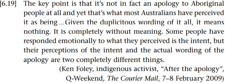 The point argued here by Foley is that, while the apology was perceived by most Australians as an apology to all indigenous Australians, it was in fact only an apology for what happened to the Stolen Generations. Such activists contend that a real apology should address all injustices against all indigenous Australians. The second point of contention is that an apology must be accompanied by meaningful compensation or reparations to count as real or sufficient: