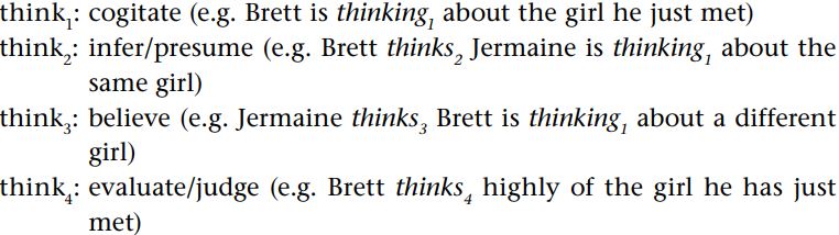 In the example above, a number of instances of explicit metapragmatic commentary have arisen. These explicit metapragmatic comments drew, in turn, on a folk metalanguage. The term metalanguage was introduced into academic discourse in the work of Alfred Tarski, a Polish logician. It refers to language that is used to talk about language, and in the case of “scientific” metalanguage, to theorize about it. In the instance above, clearly Brett and Jermaine do not use the term think in any scientific sense. In order to analyze these explicit metapragmatic comments, then, we must carefully examine this folk metalanguage. In the case of thinking, there are at least four (inter-related) senses in which it can be used in English, with the first sense arguably being basic to the other three: