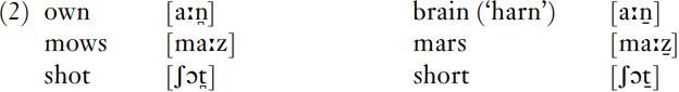 Postalveolars are reported occasionally in dialects which are on their way to losing distinct [r] sounds. Hedevind (1967) reports a contrast between dentals/alveolars and postalveolars (transcribed [n, z, t] in pairs such as those below in a dialect from Dent (Cumbria, Northern England).