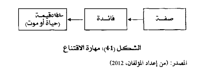 وتتضمن القدرة الاقناعية مجموعة من المهارات المتمثلة في القدرة على التحليل والابتكار والقدرة على العرض والتعبير والقدرة على الضبط الانفعالي وأيضاً القدرة على تقبل النقد. إن الاقتناع بأي فكرة هي في حقيقتها عملية شراء لهذه الفكرة، المطلوب قد لا يكون بالضرورة هو دفع المال أو أي شيء مادي ولكنه في معظم الأحيان يستوجب رد فعل معين، وفي بعض الأحيان يكون المطلوب أغلى وأثمن من المال، تخيل إقناع القائد في المعركة لمن يقودهم ببذل أنفسهم من أجل قضيتهم، أو المدير في مكان العمل لمن يعملون معه ببذل الجهد والعرق لتحقيق النجاح، وليكن من أمثلة حياتنا اليومية إقناع الشاب لوالديه في الأمور المتعلقة بمستقبله كاختيار شعبة الدراسة أو الجامعة أو الزوجة، كلها أمور هامة في حياتنا وتتطلب من طرف إقناع الآخر بوجهة نظره، ولتحقيق المهمة بنجاح علينا تصور الطرف الآخر في موقف شراء لفكرتنا. وهذا يعني الفائدة مقابل الصفة ويساوي تحويل الصفة إلى فائدة، لكن ليس المهم فقط هو تحويلها إلى فائدة ولكن إلى قيمة ومعنى والمهم هو ربط هذا المعنى في كل كلمة وكل خطوة، مثال يمكنك أن تتحدث عن الرياضة بأنها الأسلوب الأصح للجسم فيكون الحديث عن صفة ويمكنك التحدث عنها بأنها تحمي الجسم من الأمراض الخطيرة فيكون الحديث عن فائدة ويمكن التحدث عنها بأنها السبيل لإنقاذ حياتنا من مهالك محتمة وهذا المعنى هو الأكثر تأثيراً في الإنسان والشكل (1-4) يبين ذلك.