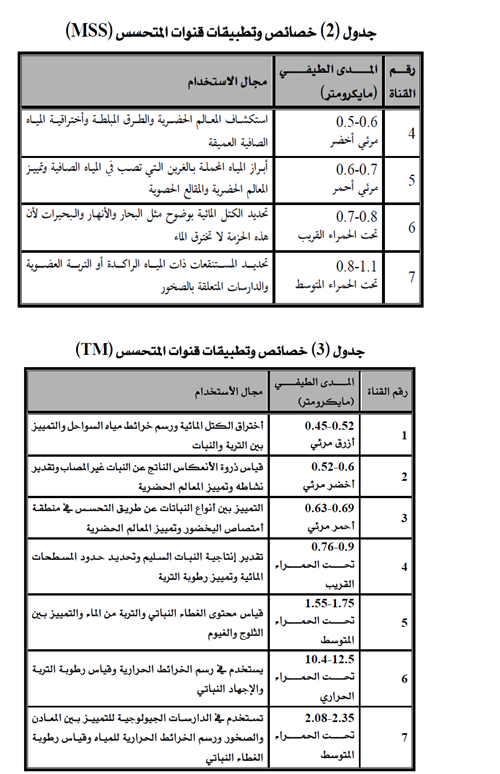الجدولان (2),(3) توضح المدى الطيفي لقنوات الماسح (MSS) و(TM)