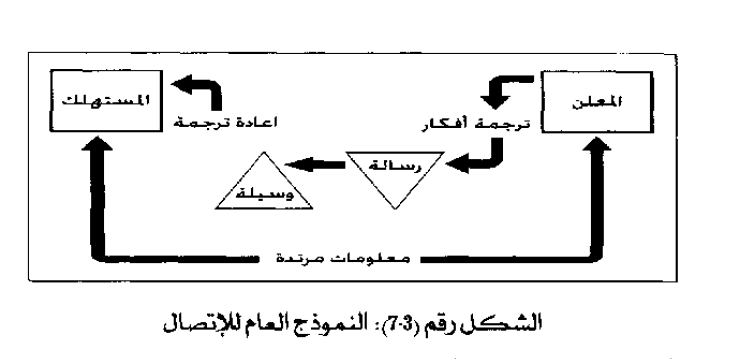 ويتم النموذج العام للإتصال وفقا لما هو مبين في الشكل رقم (3-7)، حيث تقوم كمعلن بترجمة الأفكار الموجودة لديك عن السلع والخدمات إلى رسالة إعلانية تناسب ظروف المستهلكين، إذا أن الاعتماد على المناخ المحيط بك وحدك لا يضمن أن تصل برسالتك إلى المستقبلين ، فالصابون مثلا من وجهة نظرك كمنتج ما هو إلا مجموعة من المذيبات والصودا الكاوية والشحوم، ولكنه يعني بالنسبة للمستهلك الجمال والنظافة نظره من حيث أداء السلعة ومنافعها بالنسبة له لذا فإن عليك أن تتلقى معلومات عن محيط المشتري أو المستهلك وإمكانيات تفهمه إلى الرسالة الإعلانية سواء قبل الإرسال أو بعد توجيه الرسالة الإعلانية للوقوف على آثارها بالنسبة للمستهلكين وتعديل السياسات الإعلانية بالقدر الذي يواجه أي المحراف في تنفيذ الخطة الإعلانية.