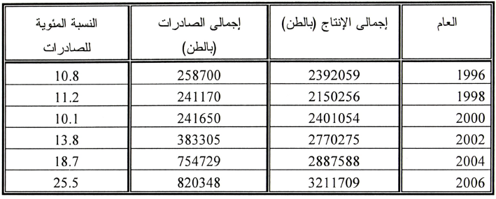 جدول (4) اجمالي انتاج وصادرات الموالح بالطن خلال الفترة من 1996 الى 2006