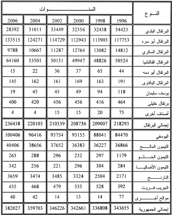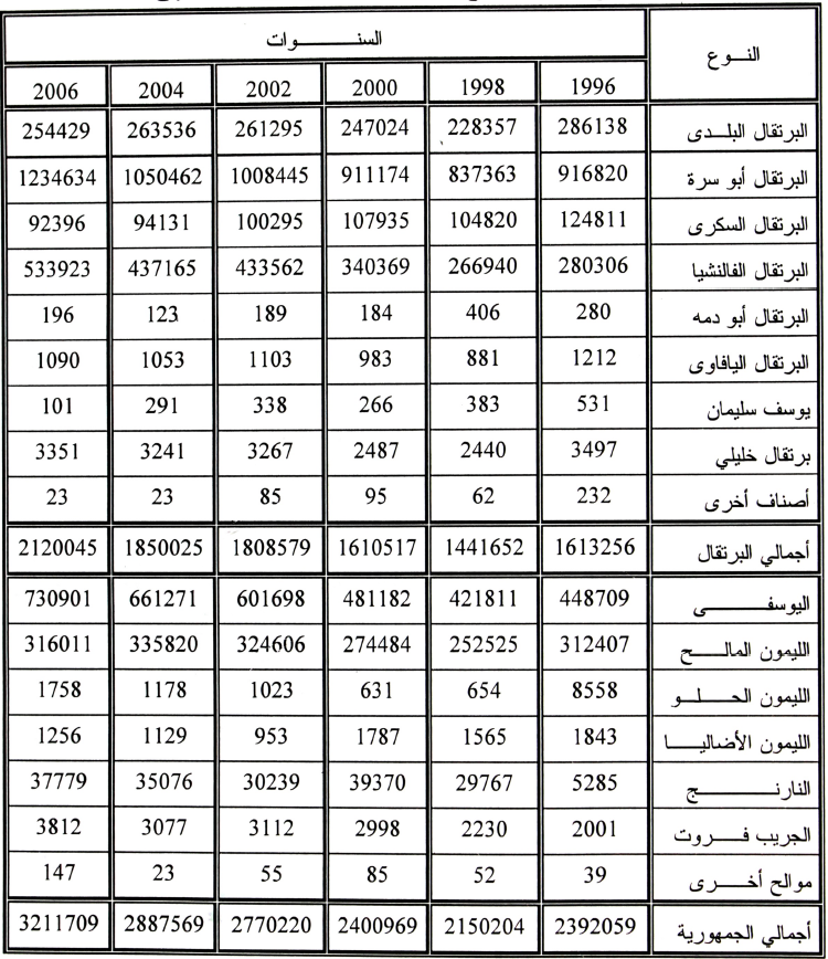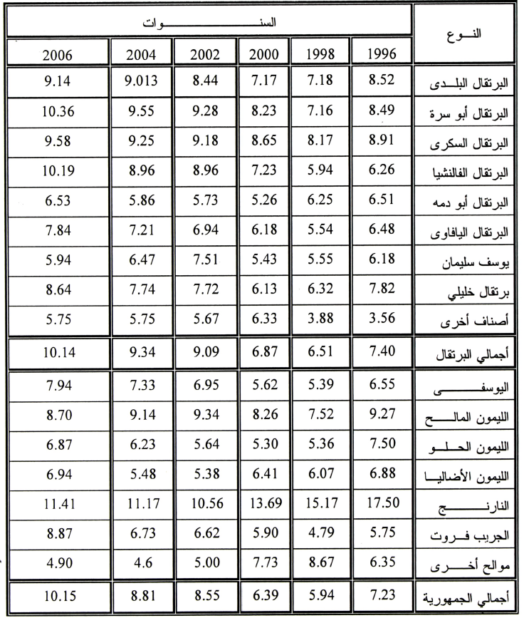 وقد زاد متوسط إنتاج فدان الموالح من 7.23 طن عام 1996 إلى 10.15 طن عام 2006 (جدول 3). ومن ذلك يتضح أن متوسط إنتاج الفدان قد زاد بنسبة %40.4 خلال الفترة من 1996 إلى 2006. وقد سجل النارنج أعلى متوسط إنتاج للفدان 11.41 طن يليه البرتقال أبو سره 10.36 طن ثم البرتقال الفالنشيا 10.19 طن.