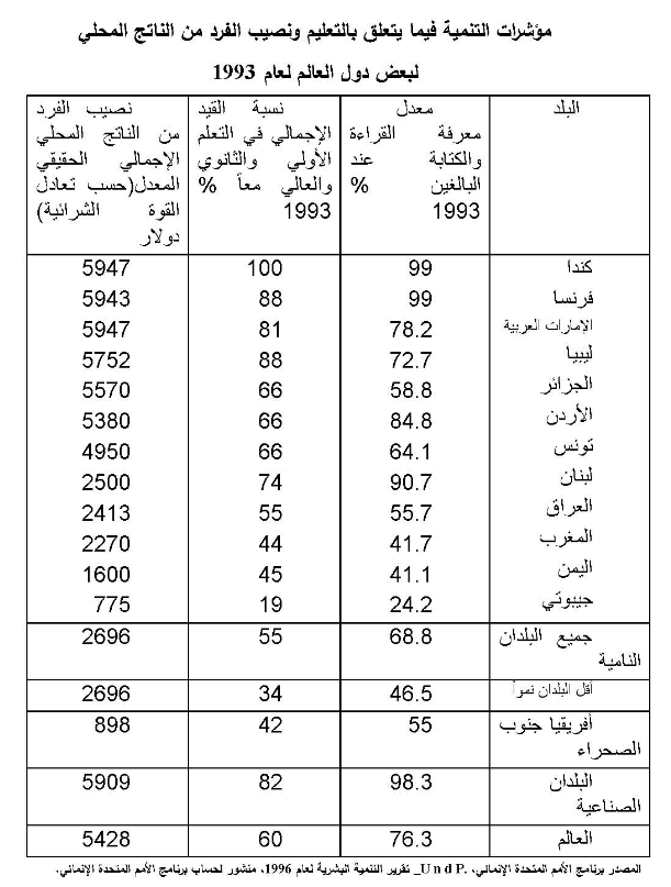 بلغ معدل معرفة القراءة والكتابة عند البالغين في البلدان الأقل نموا في العالم %46,5 من مجموع السكان عام 1993 وفي البلدان النامية 68,8% وفي البلدان الصناعية 98,3% وهذا يبين لنا مدى الفجوة الكبيرة بين البلدان المتخلفة والنامية مقارنة بالبلدان المتقدمة في مجال التعليم وتتباين الدول المختلفة مع بعضها في هذا المجال فتجد أن معدل معرفة القراءة والكتابة لدى البالغين في كندا 99% من مجموع السكان وفي فرنسا 99% أيضا ، وفي ليبيا 72,7 % وفي الجزائر 58,8% وفي اليمن 41,1 % وبلغت في أكثر دول العالم تخلفا في جيبوتي بلغت 24,2%، وعند مقارنة تلك النسب السابقة مع نصيب الفرد من الناتج المحلي الإجمالي الحقيقي نجد أن هناك علاقة بين المؤشرين فعلى سبيل المثال بلغ نصيب الفرد من الناتج المحلي الإجمالي في كندا 5947 دولار وفي فرنسا 5943دولار وفي ليبيا 5752 دولار وفي الجزائر 5570دولار وفي اليمن 1600 دولار أما في جيبوتي بلغ 775 دولار.