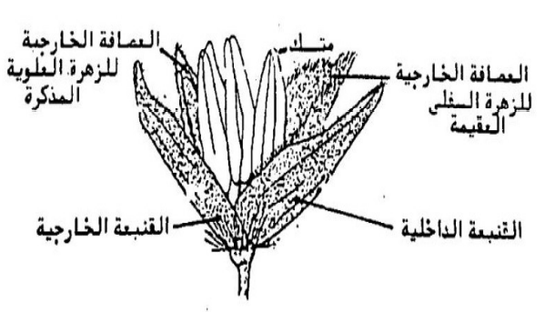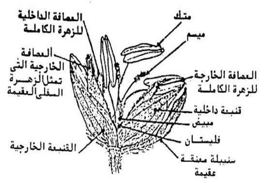 ويتكون الطلع من ثلاثة أسدية (شكل ٤)، ويتكون المتاع من مبيض واحد يحمل قلمين طويلين وينتهي كل منهما بميسم ريشي. ويبين شكل (٣) تركيب سنيبلة جالسة تحتوي على زهرة واحدة. وتحمل السنيبلة المعنقة على عنق يختلف طوله باختلاف الأصناف، وقد تكون مستديمة أو متساقطة على حسب الأصناف. وتتكون في بعض الأصناف والأنواع من قنبعتين جلديتين، وفي بعض الأصناف الأخرى تكون الزهرة العلوية مذكرة خصبة ذات عصافة خارجية وفليستان وثلاثة أسدية تنتج حبوب لقاح جيدة أما الزهرة السفلية العقيمة فتتمثل في عصافة خارجية فقط.