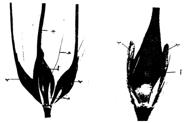 ٢- أعضاء التذكير والتأنيث تتكون كما في القمح من ثلاث أسدية ومتاع ذو مبيض واحد.