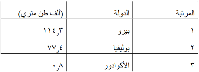 جدول ٢. الدول الأكبر إنتاجا للكينوا في العالم (منظمة الأغذية والزراعة، FAO ،٢٠١٤ م)