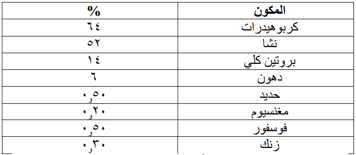 جدول (١). محتوى بذور الكينوا من الكربوهيدرات والبروتين والدهون وبعض العناصر المعدنية*.
