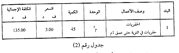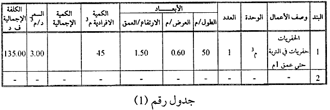 وفيه تقسم مجموعة الأعمال إلى بنود مفصلة (حفريات، صبة نظافة صبة خرسانة عادية...) وتوضع وحدات ووصف وكميات هذه البنود في هذا الجدول ومنه نستطيع الحصول على قيم هذه البنود بضرب كميات هذه البنود في أسعارها الدارجة الحالية. كما في جدول رقم (1).