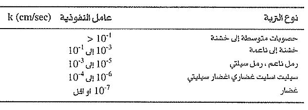 تختلف قيم عامل النفوذية لترب مختلفة بشكل كبير. في المختبر يمكن أن تحدد بواسطة تجربة النفوذية ذات الضغط الثابت أو تجربة النفوذية ذات الضغط المتغير. تجربة الضغط أكثر موافقة للترب الحبيبية وجدول (1) يزودنا بالحدود العامة لقيم مختلفة (k) من أجل ترب مختلفة من أجل الترب الحبيبية، قيم k تعتمد بشكل مبدئي على نسب الفراغات.