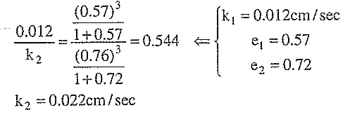 ليكن عامل النفوذية من أجل رمل ناعم cm/sec 0.012 عند نسبة فراغ 0.57. قدر عامل النفوذية للرمل عند نسبة فراغ 0.72 استخدم المعادلة التالية: