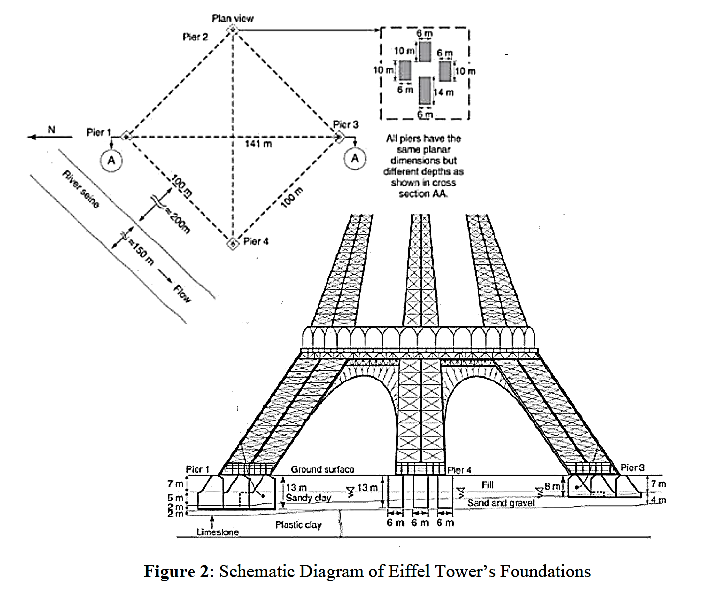 The evolution of new construction and materials methods during the early nineteenth century allow the structures to be taller and heavier than before. Thus, the old empirical design rules were no longer utilized due to the transition in construction process from rigid masonry structures to flexible structures. The introduction of new flexible structures permitted engineers to investigate the performance of foundations and develop more rational design methods. This transition began in the late nineteenth century, rapidly progressed through the twentieth century, and continues in the twenty-first century. For example, the Eiffel tower (Figure 2) is a perfect example of new type of flexible structure in which the new rational design methods were applied. This tower is the most recognized monument in the world which was built in 1889 for the Paris universal exposition. The Eiffel tower was the tallest structure in the world with 324 meters in height. The Eiffel tower is adjacent to Seine river and is underlain by uncompacted fill and soft alluvial soil. There was a bridge over Seine river and close to Eiffel tower called Alma bridge. The piers of Alma bridge were founded in this soft soil and had already settled 1 meter. Therefore, the tower could not tolerate such a large settlement. Eiffel began exploring soil conditions, as well performed a deep soil investigation by driving 2-cm pipe filled with compressed air. The air prevents groundwater from entering the pipe, and thus allowed to recover higher quality soils. The results of subsurface and deep soil exploration revealed that the two legs of the tower closest to Seine river were underlain by deep soft alluvial soil layers, while stiff alluvial soils underlie the other two legs furthest from the river. Based on the results of the in-situ investigation and laboratory tests, shallow foundations were placed on firm soils, whereas the foundations for the other two legs were placed at depth 12 m below ground surface (6 m below groundwater table).