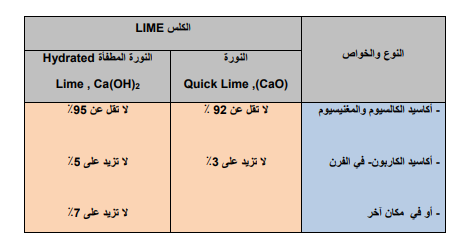 يكون الكلس المستعمل في التثبيت أما هيدروكسيد الكالسيوم صلباً أو نورة مطفأة أو أوكسيد الكالسيوم (النورة) وكما مبين في الجدول الآتي :