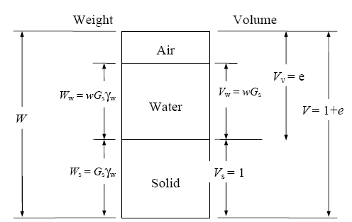 The soil is particulate materials which can contain all three phases of matter (solid, liquid, and gas). The solid portion represents actual soil’s particles, while the liquid and gas portions represent voids existed between soil’s particles. The interaction between these three phases can be illustrated and described using a “Phase Diagram”, see Figure 1.