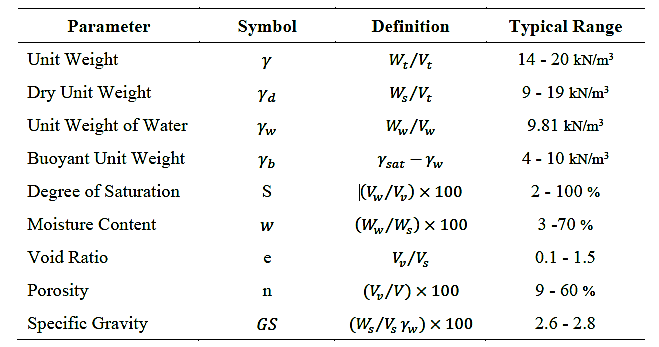 Table 1: Common Soil Weight-Volume Parameters and their Typical Values