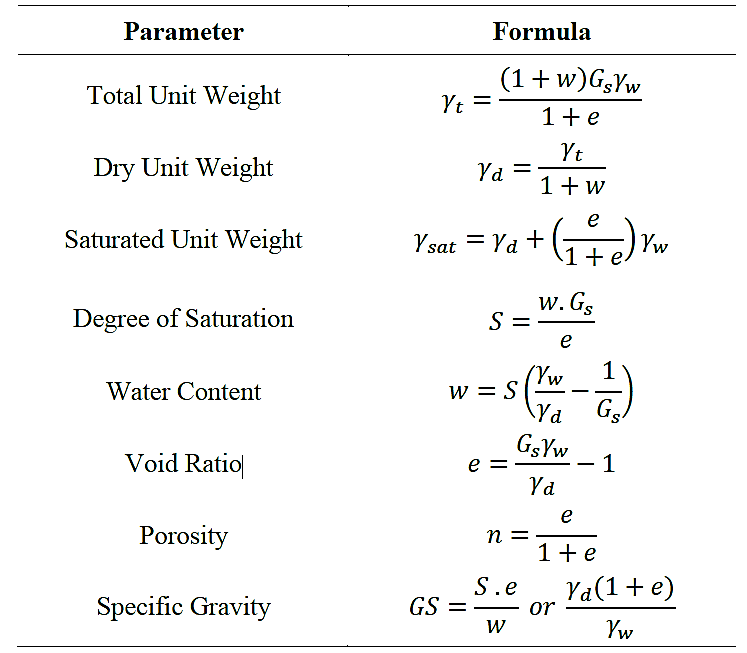 Several formulas were developed to express the relationships between weight-volume parameters of the soil. The following table summarizes the most common relationships used in the foundation engineering: