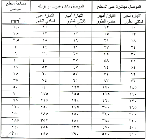 جدول يبين معدل التيار الذي يتحمله الموصل النحاسي الاحادي والثلاثي الطور المعزول