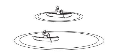 شكل 1-1: التموجات التي تسببها حركة القارب تبدو للراصد الموجود على القارب أنها تتحرك على نحو أبطأ في اتجاه المقدمة عن المؤخرة.