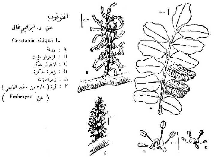 شكل يبين أزهار وثمار وأوراق الخرنوب