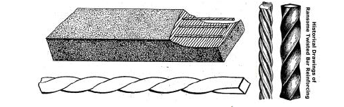 - في العام 1884 نشر عن الامريكي Emest. L. Rasome انه أستخدم الخرسانة المسلحة في عدة مشروعات وبالإضافة لذلك سجلت له براءة إختراع حيث أستخدام قضبان التسليح الملتوية والموضحه بالشكل (6) كتسليح للخرسانة وكانت هذ القضبان ذات مقطع مربع حيث يتم لويها على البارد في لغة واحده وكان طول قضيب التسليح حينها لا يتعدى 12 مره قصـ القضيب وكان هدفه من إستخدام هذه القضبان هو تحقيق تماسك أكبر بين كل من الخرسانة والتسليح .