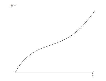 شكل 2-18: المعامل R المرتبط بحجم الكون في مقابل الزمن المنقضي منذ الانفجار العظيم. في البداية، يتباطأ معدل حركة R بسبب قوى التجاذب بين العناقيد المجرية. لكن في أوقات لاحقة يهيمن الإسهام الذي تقدمه الطاقة المظلمة؛ ومن ثم يتسارع معدل حركة R.